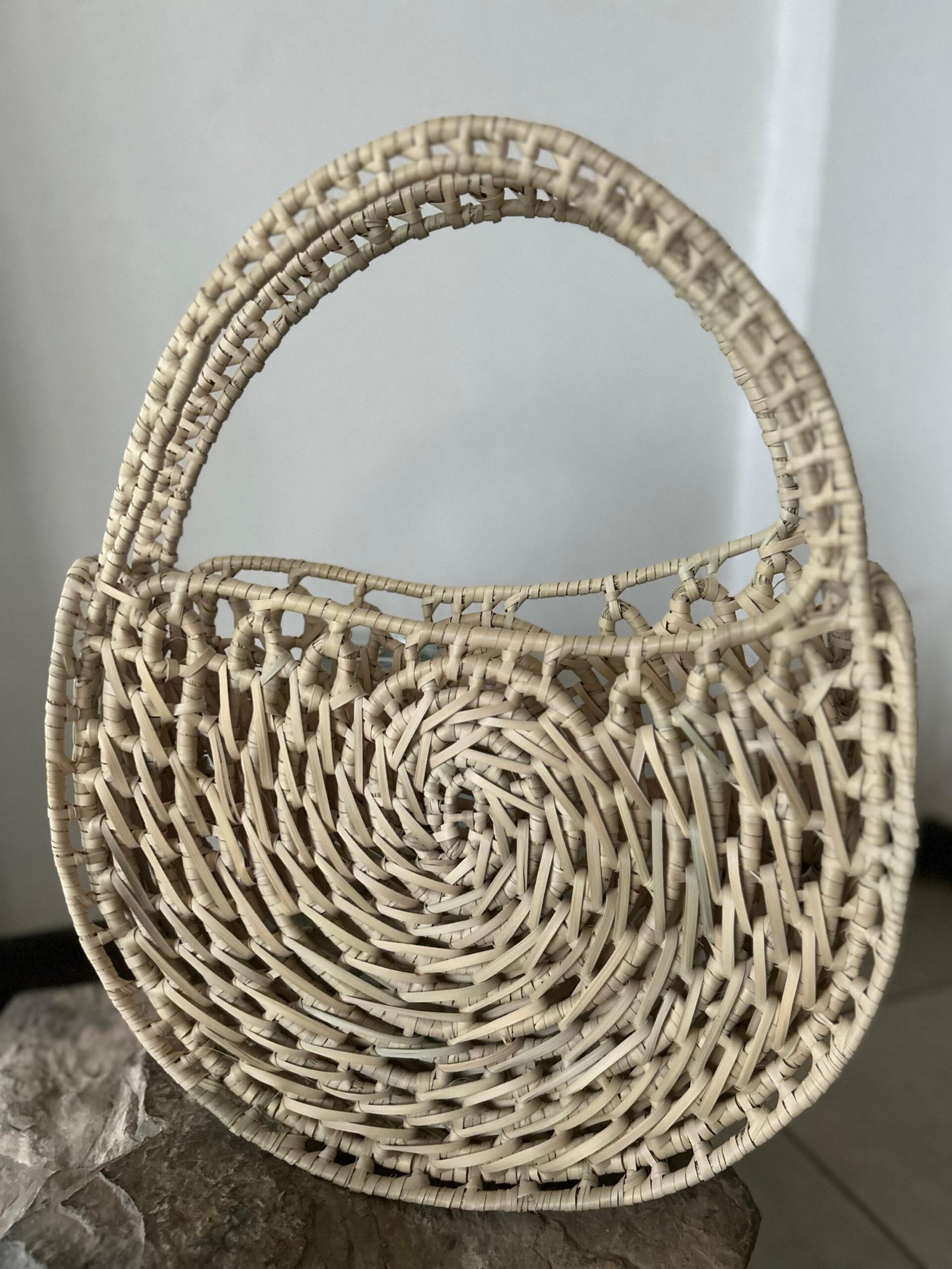 El bolso artesanal en espiral de Las Palmas Vibes es una obra única hecha a mano con palma natural. Su diseño abierto y ligero refleja la esencia de lo artesanal, resaltando los detalles en espiral que lo convierten en una pieza auténtica y elegante.