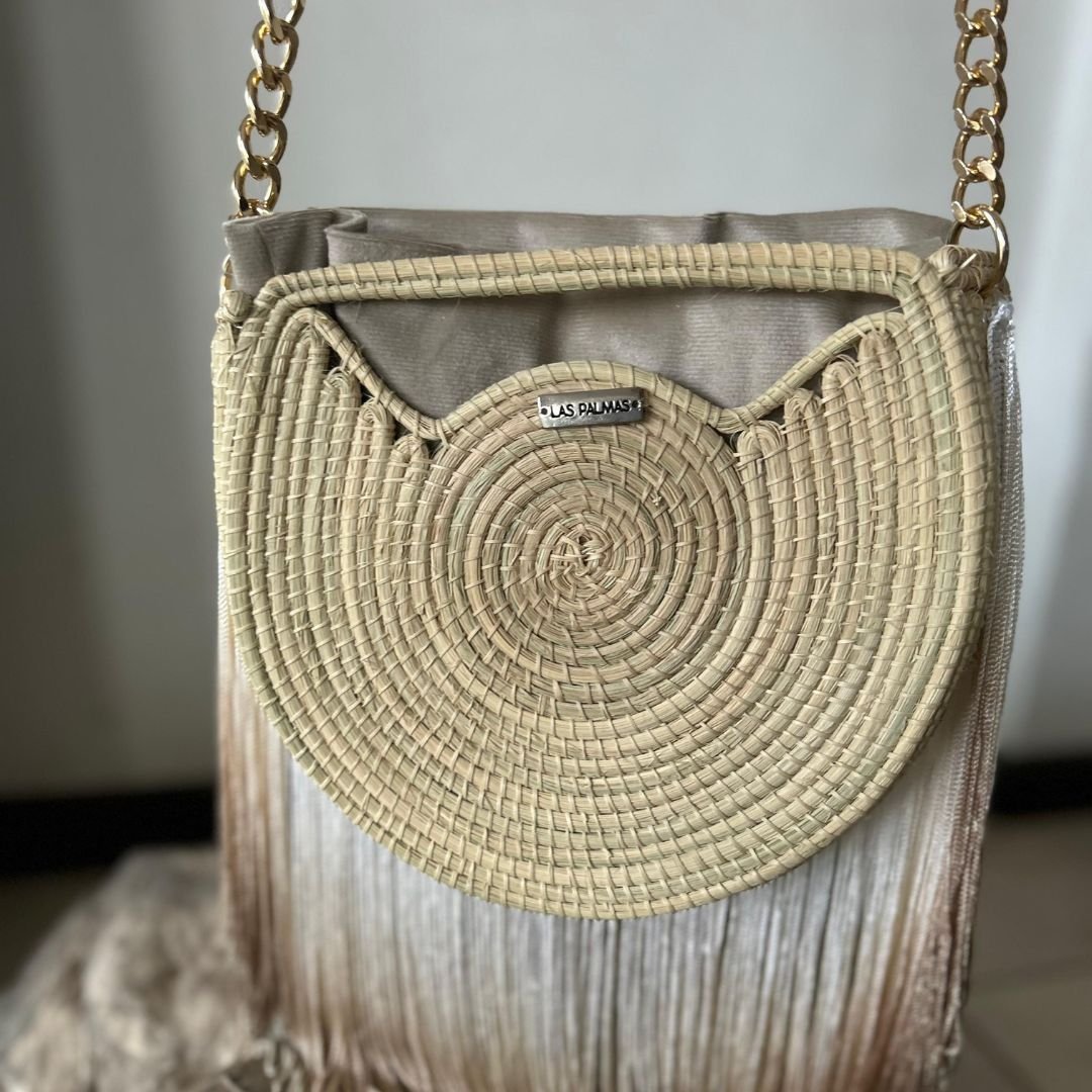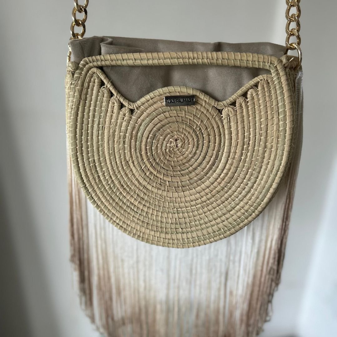 El bolso semicircular de palma con flecos de Las Palmas Vibes es una pieza artesanal única que combina tradición y estilo moderno. Tejido a mano con palma natural, destaca por su diseño semicircular que aporta originalidad y elegancia.