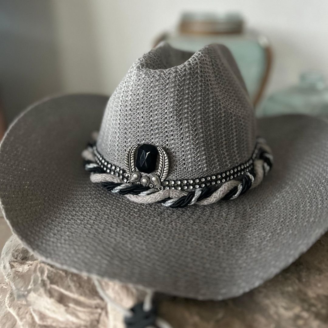 El sombrero cowboy de Las Palmas Vibes está confeccionado en fibra natural de tono gris, con un tejido ligero y transpirable que aporta frescura y comodidad. Su diseño elegante se realza con una piedra negra y tiras entrelazadas . La chapita con Las Palmas refuerza su identidad como una pieza de estilo auténtico.